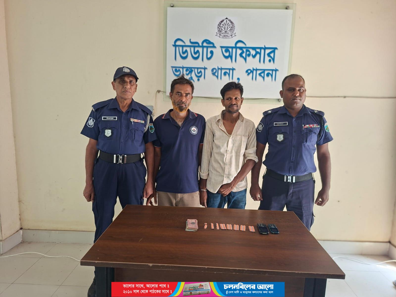 পুলিশ সূত্রে জানা যায়, রবিবার (১২ এপ্রিল) রাত সাড়ে ১০টার দিকে গোপন সংবাদের ভিত্তিতে ভাঙ্গুড়া থানা পুলিশের একটি দল উপজেলার ভাঙ্গুড়া দক্ষিণ পাড়ায় অভিযান পরিচালনা করে। অভিযানে নেতৃত্ব দেন এসআই নাইমুর রহমান। তার সঙ্গে ছিলেন এএসআই জালাল উদ্দিনসহ সঙ্গীয় ফোর্স। অভিযান চলাকালে দক্ষিণ পাড়ার মৃত রাজিব শেখের ছেলে চিহ্নিত মাদক কারবারি সবুজ শেখের বাড়িতে তল্লাশি চালানো হয়। এ সময় ঘটনাস্থল থেকে চৌবাড়িয়া উত্তর পাড়ার মৃত আবুল কাশেমের ছেলে জাকির হোসেন (৪২) এবং পার্শ্ববর্তী চাটমোহর উপজেলার নারিকেল পাড়ার মৃত আব্দুল জব্বারের ছেলে শরিফুল ইসলাম (৪৫) কে আটক করা হয়।
