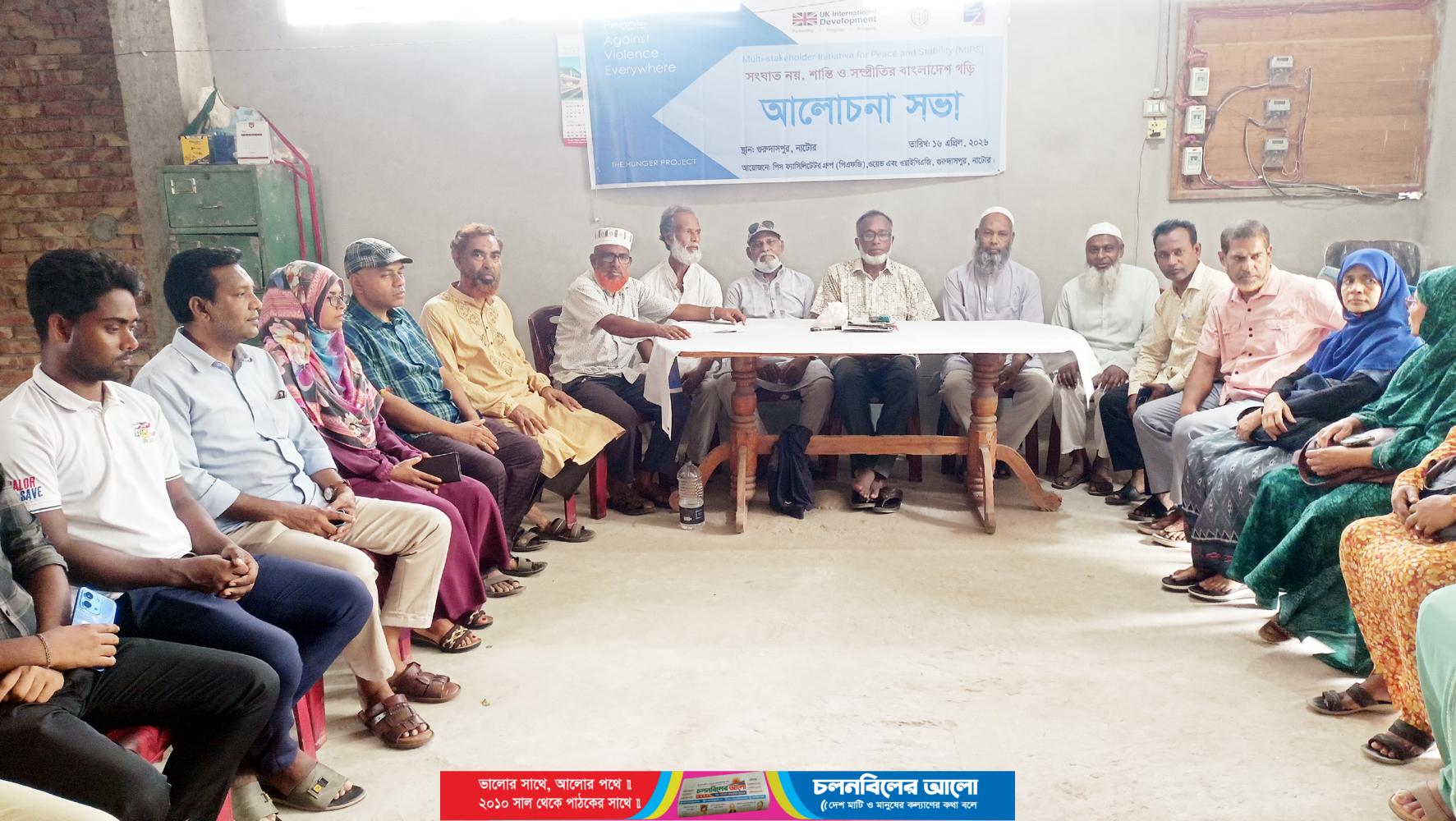 ‘সংঘাত নয়, শান্তি ও সম্প্রীতির বাংলাদেশ গড়ি’ বিষয়ের ওপর আলোকপাত করে নাটোরের গুরুদাসপুরে আলোচনা সভা অনুষ্ঠিত হয়েছে। বৃহস্পতিবার বিকেলে দি হাঙ্গার প্রজেক্টের উপজেলা কো-অর্ডিনেটর এইচএম একরামুল হকের সভাপতিত্বে সংগঠনটির অস্থায়ী কার্যালয়ে এ সভা হয়।