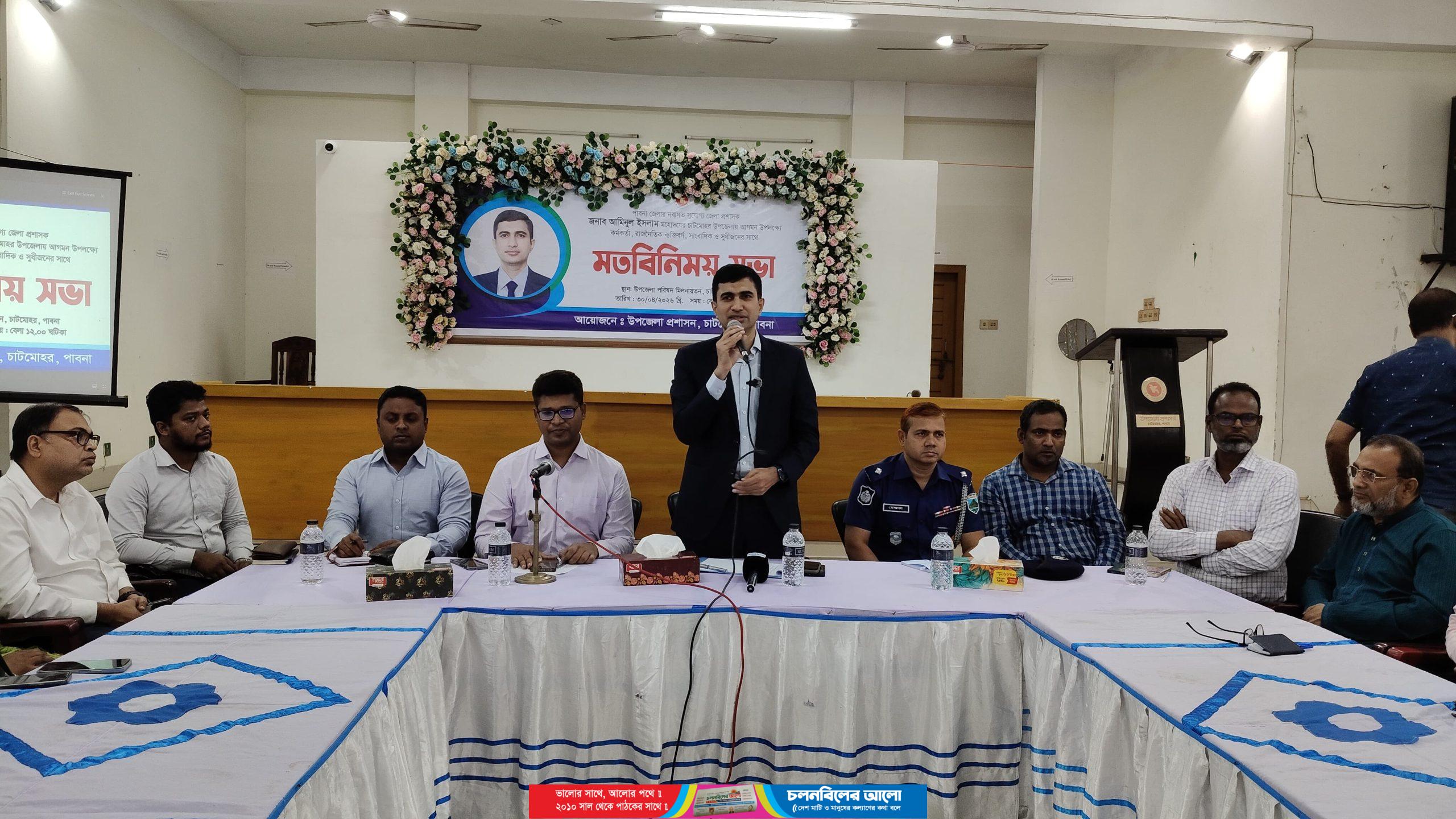 চাটমোহর (পাবনা), ৩০ এপ্রিল ২০২৬ পাবনা জেলার নবাগত জেলা প্রশাসক মোঃ আমিনুল ইসলাম বৃহস্পতিবার (৩০ এপ্রিল) দুপুর ১টায় চাটমোহর উপজেলা প্রশাসনের হলরুমে চাটমোহরের সর্বস্তরের মানুষের সাথে খোলামেলা মতবিনিময় সভা করেছেন।