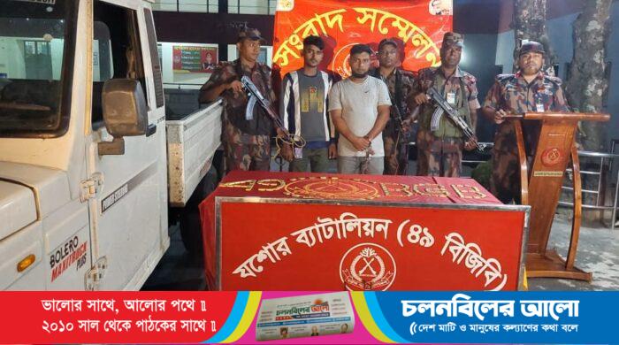 ভারতে পাচারের সময় যশোরের বেনাপোল আমড়াখালি চেকপোস্ট থেকে ১১২টি স্বর্ণের বারসহ দুই পাচারকারীকে আটক করেছেন বর্ডার গার্ড বাংলাদেশ (বিজিবি) সদস্যরা। বুধবার (১৬ নভেম্বর) রাত ১০ টার সময় বেনাপোলমুখী একটি পিকআপ