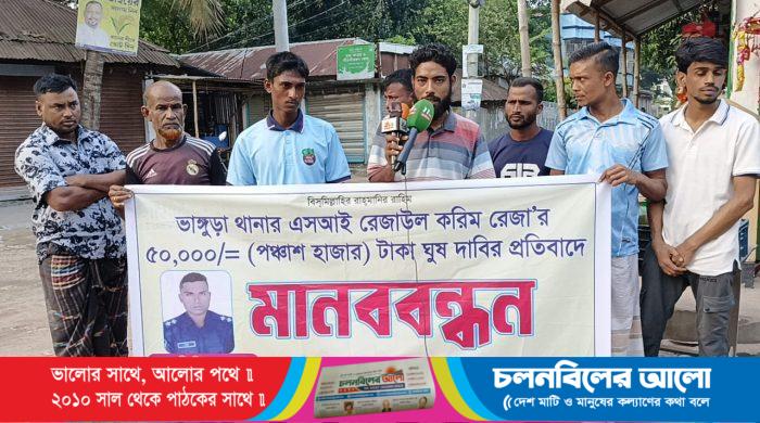 পাবনার ভাঙ্গুড়া উপজেলায় পুলিশ কর্মকর্তা এসআই রেজাউল করিমের বিরুদ্ধে চাঁদা দাবি করার অভিযোগে স্থানীয় এক ব্যক্তি ও এলাকাবাসী মানববন্ধন করেছেন। মঙ্গলবার (২৮ অক্টোবর) বিকেল ৫টায় উপজেলা পরিষদের মোড়ে এই মানববন্ধন