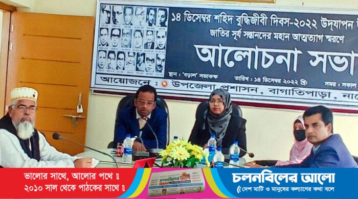 নাটোরের বাগাতিপাড়ায় ১৪ ডিসেম্বর শহীদ বুদ্ধিজীবী দিবস-২০২২ উদযাপন উপলক্ষে জাতির সূর্য সন্তানদের মহান আত্মত্যাগের স্মরণে এক মুক্ত আলোচনা সভা অনুষ্ঠিত হয়েছে। বুধবার সকালে উপজেলার বড়াল সভাকক্ষে উপজেলা প্রশাসনের আয়োজনে ইউএনও