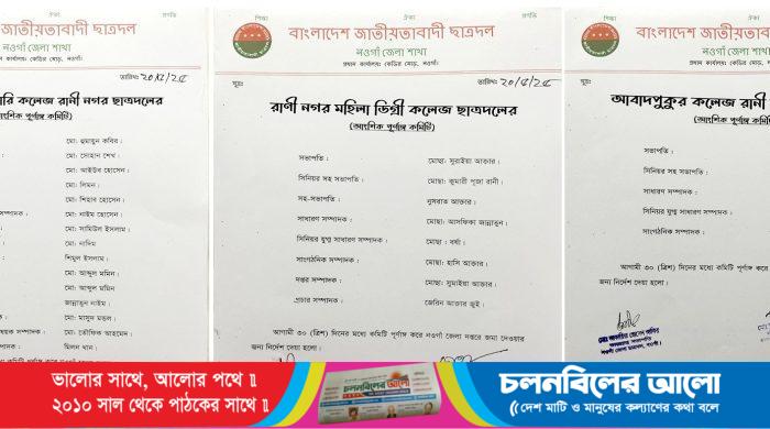 নওগাঁর রাণীনগরে তিনটি কলেজে ছাত্রদলের নতুন কমিটি গঠন করা হয়েছে। রবিবার নওগাঁ জেলা ছাত্রদল এ তিনটি কলেজ শাখা ছাত্রদলের আংশিক কমিটি প্রকাশ করা হয়। রাণীনগর শের-এ বাংলা সরকারি কলেজ, রাণীনগর
