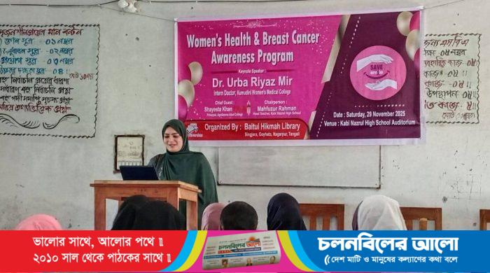 টাঙ্গাইলের নাগরপুরে শনিবার (২৯ নভেম্বর ২০২৫) সকালে কবি নজরুল উচ্চ বিদ্যালয়ের হলরুমে গয়হাটা ইউনিয়নের সিংজোড়া গ্রামে অবস্থিত ঐতিহ্যবাহী বাইতুল হিকমাহ পাঠাগার–এর উদ্যোগে নারীদের স্বাস্থ্য সচেতনতা ও স্তন ক্যান্সার প্রতিরোধ বিষয়ক