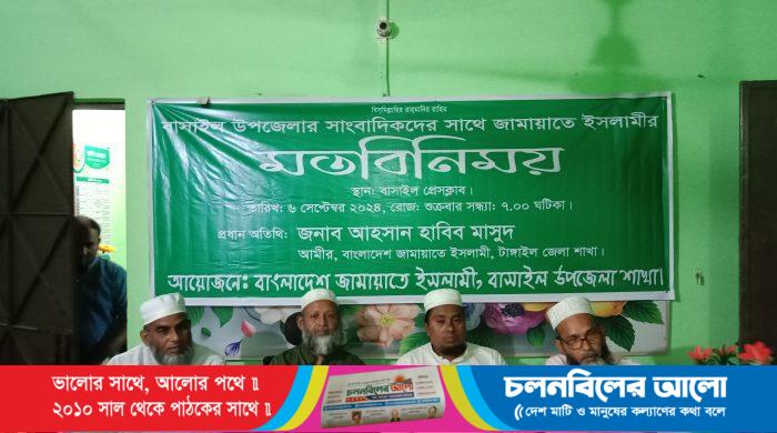 টাঙ্গাইলের বাসাইলে সাংবাদিকদের সাথে বাংলাদেশ জামায়াতে ইসলামী’র নেতাকর্মীদের মতবিনিময় সভা অনুষ্ঠিত হয়েছে। শুক্রবার (৬ সেপ্টেম্বর) সন্ধ্যায় বাসাইল প্রেসক্লাবে এ মতবিনিময় সভার আয়োজন করা হয়। অনুষ্ঠানে বক্তব্য রাখেন বাংলাদেশ জামায়াতে ইসলামী