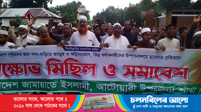 সারা দেশে দুর্বৃত্তদের দ্বারা হামলা ,ভাংচুর, অগ্নিসংযোগ ও ভিন্নধর্মাবলম্বীদের উপাসনালয়ে হামলার প্রতিবাদে পঞ্চগড়ের আটোয়ারীতে বিক্ষোভ মিছিল ও সমাবেশ করেছে বাংলাদেশ জামায়াতে ইসলামী। দীর্ঘদিন পর বাংলাদেশ জামায়াতে ইসলামী আটোয়ারী উপজেলা শাখা’র