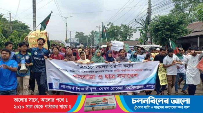 সরকারি চাকরিতে কোটা বাতিলসহ ৪ দফা দাবিতে প্রায় দুই ঘন্টা ঢাকা-রংপুর মহাসড়ক অবরোধ করে বিক্ষোভ করেছেন বেগম রোকেয়া বিশ্ববিদ্যালয় (বেরোবি) শিক্ষার্থীরা। কর্মসূচিতে বিশ্ববিদ্যালয়ের বিভিন্ন বিভাগের প্রায় এক হাজার শিক্ষার্থী উপস্থিত