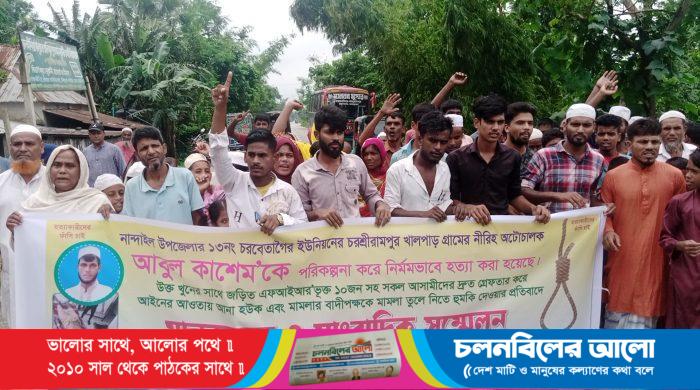 ময়মনসিংহের নান্দাইল উপজেলার চরবেতাগৈর ইউনিয়নের চরশ্রীরামপুর খালপাড় গ্রামের নীরিহ অটোচালক আবুল কাশেম হত্যা মামলার আসামীদের গ্রেফতার সহ দৃষ্টান্তমূলক শাস্তি ফাঁসির দাবীতে মানববন্ধন ও বিক্ষোভ মিছিল অনুষ্ঠিত হয়েছে। শুক্রবার সকাল ১১