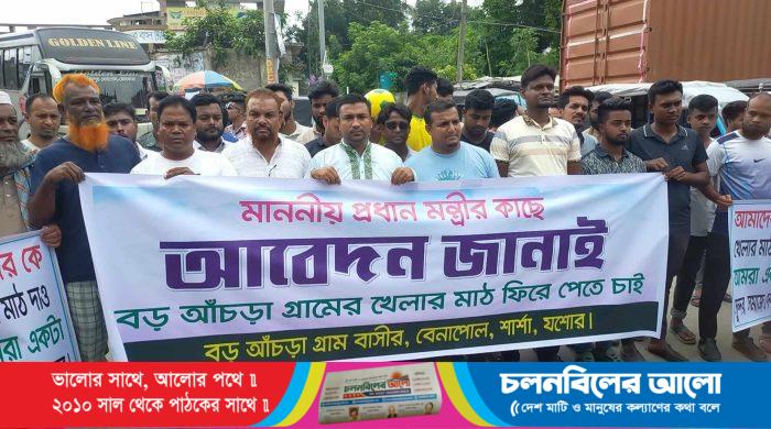 “মাদক চাইনা খেলতে চাই, আমাদের মাঠ আমাদের অধিকার” এই স্লোগানকে সামনে নিয়ে বেনাপোল স্থলবন্দরে খেলার মাঠ ফিরে পাওয়ার দাবিতে মানববন্ধন ও সমাবেশ করেছে বেনাপোল বড় আঁচড়া গ্রামবাসী। শনিবার বেলা