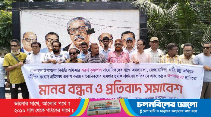 ময়মনসিংহের নান্দাইলে পেশাগত কাজে অসহযোগিতা, দুর্নীতি ও হুমকির প্রতিবাদে উপজেলা নির্বাহী কর্মকর্তার (ইউএনও) বিরুদ্ধে মানববন্ধন করেছে ঐক্যবদ্ধ সাংবাদিক ফোরাম নামে সাংবাদিকদের একটি প্লাটফর্ম। বুধবার (১২ জুন) বেলা ১১টার দিকে উপজেলা