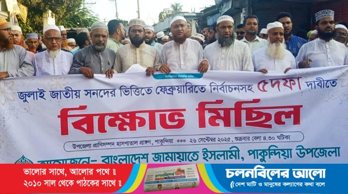আগামী ফেব্রুয়ারিতে জুলাই সনদের ভিত্তিতে জাতীয় নির্বাচন অনুষ্ঠানসহ ৫ দফা দাবিতে জামায়াতে ইসলামীর পূর্বঘোষিত বিক্ষোভ মিছিল অনুষ্ঠিত হয়েছে। শুক্রবার বিকেল ০৪:৩০ ঘটিকায় কিশোরগঞ্জের পাকুন্দিয়ায় উপজেলা প্রাণিসম্পদ ও ভেটেনারি হাসপাতাল সংলগ্ন
