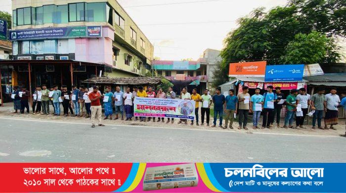সাতক্ষীরা সদর উপজেলার ১১ নং ঝাউডাঙ্গা ইউনিয়নের ঝাউডাঙ্গা মাধ্যমিক বিদ্যালয়ের প্রধান শিক্ষক কতৃক সাংবাদিকের প্রান নাশের হুমকি ও দুর্নীতির প্রতিবাদে এলাকাবাসীর মানববন্ধন অনুষ্ঠিত হয়েছে।শনিবার বিকাল ৫ টার সময় ঝাউডাঙ্গা বঙ্গবন্ধু