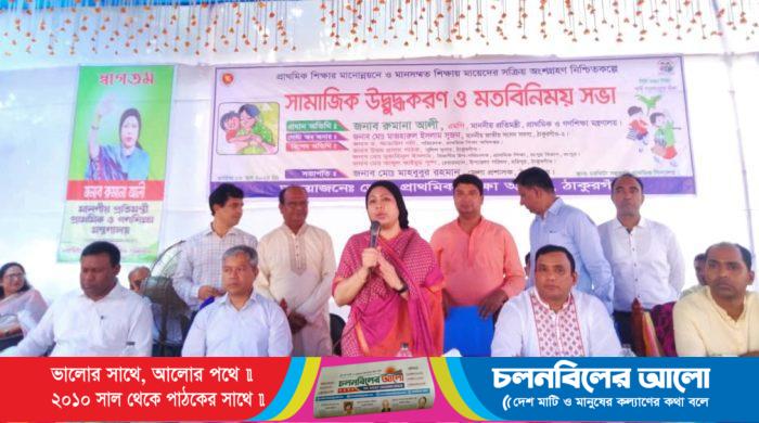 সামাজিক উদ্বুদ্ধকরণ ও মতবিনিময় সভায় বক্তব্য দেন প্রাথমিক ও গণশিক্ষা প্রতিমন্ত্রী রুমিনা আলী। প্রাথমিক ও গণশিক্ষা প্রতিমন্ত্রী রুমিনা আলী বলেছেন, প্রাথমিক শিক্ষা বিভাগের এত সমস্যা একবারেই সমাধান করা সম্ভব না। সরকার
