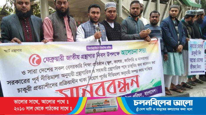 বেসরকারি শিক্ষা প্রতিষ্ঠানে (স্কুল, কলেজ, কারিগরি ও মাদরাসায়) সরকারের পূর্ব নীতিমালা অনুযায়ী গ্রন্থাগারিক ও সহকারী গ্রন্থাগারিক পদে আবেদন করা চাকরি প্রত্যাশীদের নিয়োগ পূর্বের নিয়মে সম্পন্ন করার দাবিতে মানববন্ধন কর্মসূচি পালন