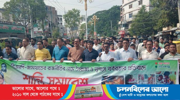বিএনপি-জামাতের ডাকা অবৈধ হরতাল-অবরোধ, অগ্নি-সন্ত্রাস ও নৈরাজ্যের প্রতিবাদে কেন্দ্রীয় আওয়ামী লীগের কর্মসূচির অংশ হিসেবে রাজশাহী মহানগর আওয়ামী লীগের অবস্থান কর্মসূচি, শান্তি সমাবেশ ও বিক্ষোভ মিছিল অনুষ্ঠিত হয়েছে। সোমবার (৪ ডিসেম্বর)