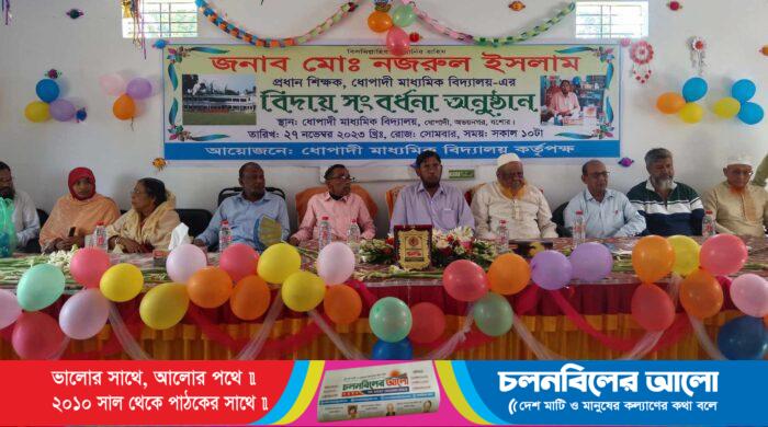 অভয়নগরে ধোপাদী মাধ্যমিক বিদ্যালয়ের প্রধান শিক্ষক মো. নজরুল ইসলামের বিদায় সংবর্ধনার অনুষ্ঠান অনুষ্ঠিত হয়েছে। সোমবার বেলা ১১ টায় অত্র প্রতিষ্ঠানের সভাকক্ষে এ অনুষ্ঠান অনুষ্ঠিত হয়। ধোপাদী মাধ্যমিক বিদ্যালয়ের সভাপতি ইসমাইল
