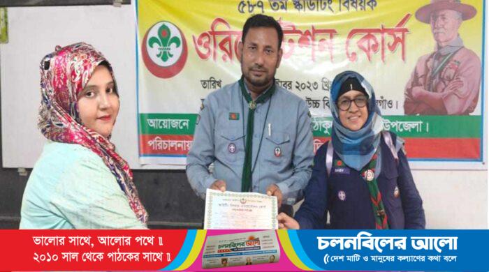 বাংলাদেশ স্কাউটস দিনাজপুর অঞ্চলের পরিচালনায় ও ঠাকুরগাঁও সদর উপজেলা স্কাউটসের ব্যবস্থাপনায় ৫৮৭ তম স্কাউটিং বিষয়ক ওরিয়েন্টশন কোর্স ১১ অক্টোবর বুধবার অনুষ্ঠিত হয়েছে। জেলার আর কে স্টেট উচ্চ বিদ্যালয়ে দিনব্যাপী আয়োজিত
