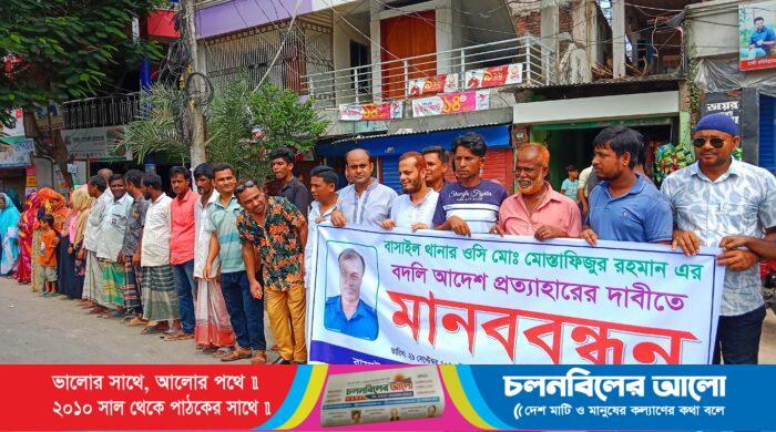 টাঙ্গাইলের বাসাইল থানার ওসি মো. মোস্তাফিজুর রহমানের বদলি আদেশ প্রত্যাহারের দাবিতে মানববন্ধন কর্মসূচী পালিত হয়েছে। শুক্রবার(২৯ সেপ্টেম্বর) সকালে ঘন্টাব্যাপী মানববন্ধনে উপজেলার তিন শাতাধিক মানুষ অংশ নেয়। এ সময় তারা বদলিকৃত