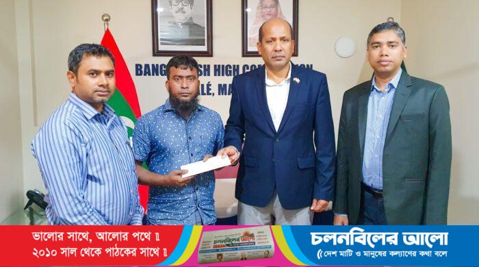 গুরুতর অসুস্থ মালদ্বীপ প্রবাসী বাংলাদেশী কর্মী মোঃ মাইন উদ্দিন কে দেশে ফিরে যাওয়ার জন্য ওয়েজ আর্নার্স কল্যাণ বোর্ড-Wage Earners’ Welfare Board এর অর্থায়নে একটি এয়ার টিকেট হস্তান্তর করেন মালদ্বীপে নিযুক্ত