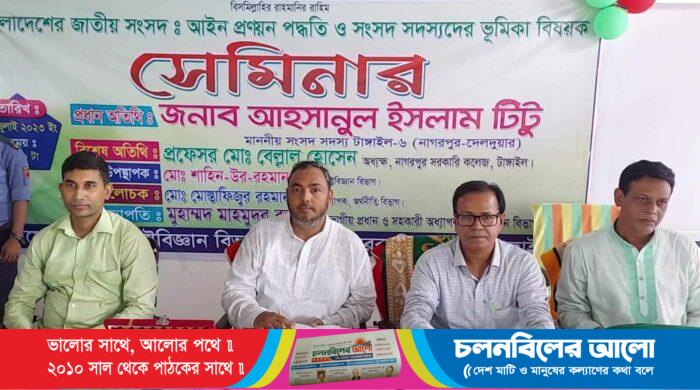 টাঙ্গাইলের নাগরপুরে ‘জাতীয় সংসদে আইন প্রণয়ন পদ্ধতি ও সংসদ সদস্যদের ভূমিকা’ বিষয়ক সেমিনার অনুষ্ঠিত হয়েছে। এতে প্রধান অতিথি হিসেবে উপস্থিত ছিলেন টাঙ্গাইল ৬ (নাগরপুর-দেলদুয়ার) আসনের সংসদ সদস্য আহসানুল ইসলাম টিটু
