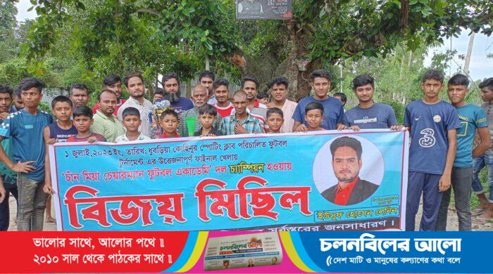 টাঙ্গাইলের নাগরপুরে ধুবড়িয়া ইউনিয়নে ঐতিহাসিক কোহিনুর স্পোর্টিং ক্লাব পরিচালনায় অনুষ্ঠিত ফুটবল টুর্নামেন্ট ‘চ্যাম্পিয়ন’ চাঁন মিয়া চেয়ারম্যান ফুটবল একাডেমি দলের পক্ষ থেকে বিজয় মিছিল ও গণভোজ অনুষ্ঠিত হয়েছে। সোমবার (৩ জুলাই)
