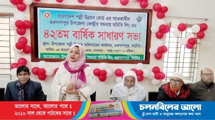 বাংলাদেশ পল্লী উন্নয়ন বোর্ডের আওতাধীন নাটোরের গুরুদাসপুর উপজেলা কেন্দ্রীয় সমবায় সমিতি লিমিটেডের (ইউসিসিএ) ৪২তম বার্ষিক সাধারণ সভা ও বাজেট অধিবেশন অনুষ্ঠিত হয়েছে। অধিবেশনে মোট প্রায় ৭৪ লাখ টাকার বাজেট পেশ