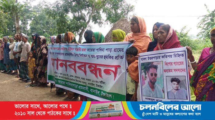 টাঙ্গাইলের বাসাইলে খেলার মাঠ জোরপূর্বক দখলের চেষ্টা ও সংখ্যালঘু হিন্দু সম্প্রদায়ের পরিবারসহ গ্রামবাসীর ওপর হামলার প্রতিবাদে মানববন্ধন ও সংবাদ সম্মেলন করেছে এলাকাবাসী। সোমবার (৫ জুন) উপজেলার হাবলা ইউনিয়নের আরুহা শালিনাপাড়া