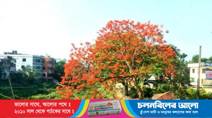 প্রকৃতির যে দিকে তাকানো যায় গাছের সবুজ পাতা অড়াল করে দৃষ্টি কাড়ে কৃষ্ণচূড়ার লাল রঙ। টাঙ্গাইলের গোপালপুরে বৈরান নদীর তীরে গোপালপুর পৌরসভার সামনে রাস্তায় পাশে কৃষ্ণচূড়া গাছটিতে আনাচে কানাচে ছেয়ে গেছে
