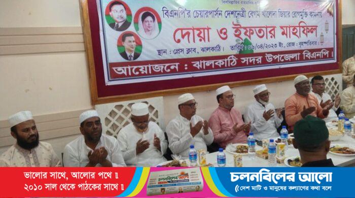 বিএনপি’র চেয়ারপার্সন দেশনেত্রী বেগম খালেদা জিয়ার রোগমুক্তি কামনায় ঝালকাঠি সদর উপজেলা বিএনপি’র আয়োজনে দোয়া ও ইফতার মাহফিল অনুষ্ঠিত হয়েছে। এতে সভাপতিত্ব করেন সদর উপজেলা বিএনপি’র সভাপতি অধ্যাপক এজাজ আহমেদ। প্রধান