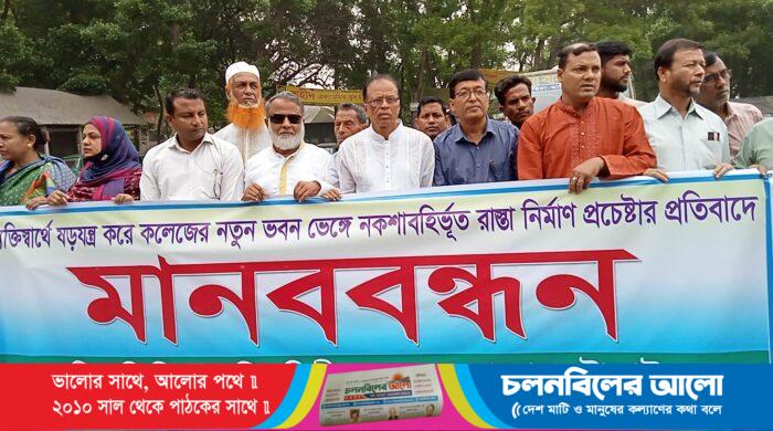 টাঙ্গাইলের নাগরপুরে ব্যক্তিস্বার্থে ষড়যন্ত্র করে পাকুটিয়ায় বি.সি.আর.জি.ডিগ্রী কলেজের নতুন ভবন ভেঙ্গে নকশা বহির্ভূত রাস্তা করার প্রতিবাদে মানববন্ধন করেছে কলেজের শিক্ষক ও শিক্ষার্থীরা। শনিবার (১৯ মার্চ) সকালে কলেজ ভবনের সামনে মানববন্ধন