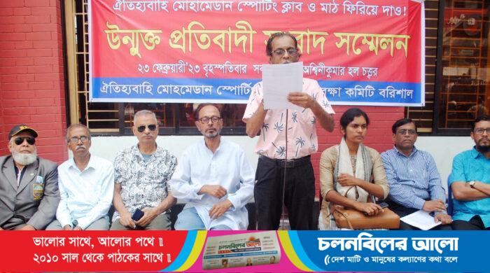 রাজপথে আন্দোলন ও আইনি লড়াইয়ের মাধ্যেমে বরিশালর ঐতিহ্যবাহী মোহামেডান স্পোটিং ক্লাব ও মাঠ রক্ষার দাবিতে উন্মুক্ত প্রতিবাদী সংবাদ সম্মেলন করেছেন মোহামেডান স্পোটিং ক্লাব ও মাঠ রক্ষা কমিটির নেতৃবৃন্দরা। বৃহস্পতিবার বেলা