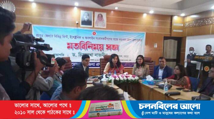 নবাগত জেলা প্রশাসক ডঃচিত্রলেখা নাজনীন এর সাথে রংপুরে কর্মরত প্রিন্ট ও ইলেকট্রনিক মিডিয়ার সংবাদকর্মীদের সাথে মতবিনিময় সভা অনুষ্ঠিত হয়েছে। সোমবার (৫ ডিসেম্বর) সকালে জেলা প্রশাসকের সম্মেলন কক্ষে প্রধান অতিথি হিসেবে