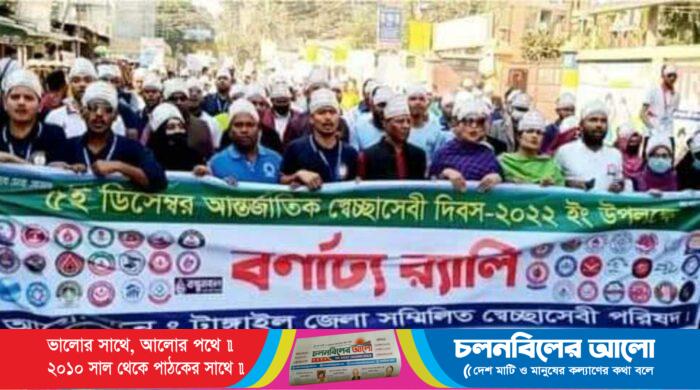 আন্তর্জাতিক স্বেচ্ছাসেবী দিবস উপলক্ষে টাঙ্গাইল জেলা সম্মিলিত স্বেচ্ছাসেবী পরিষদের বর্ণাঢ্য র্যালী অনুষ্ঠিত হয়েছে। সোমবার(০৫ ডিসেম্বর) সকালে শহরের ভিক্টোরিয়া রোড থেকে র্যালীটি বের হয়ে শহরের গুরুত্বপূর্ণ সড়ক প্রদক্ষিণ করে পূণরায় ভিক্টোরিয়া