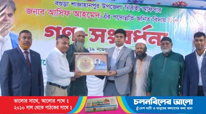 অতিরিক্ত জেলা প্রশাসক পদে পদোন্নতি প্রাপ্ত শাজাহানপুর উপজেলা নির্বাহী অফিসার আসিফ আহমেদকে গণ-সংবর্ধনা দিয়েছে বগুড়ার শাজাহানপুর উপজেলাবাসি। শনিবার বিকেলে উপজেলা পরিষদ চত্বরে তাকে গণ-সংবর্ধনা প্রদান করা হয়। আয়োজক কমিটির আহবায়ক