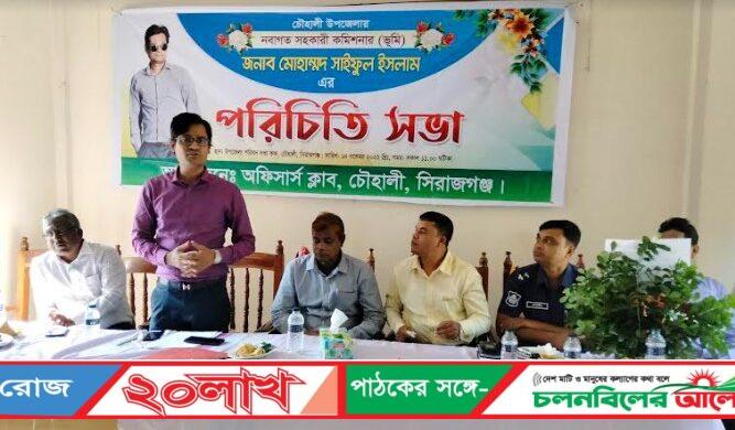 সিরাজগঞ্জের চৌহালী উপজেলায় নবাগত সহকারী কমিশনার( ভূমি) এবং ভারপ্রাপ্ত উপজেলা নির্বাহী কর্মকর্তা মোহাম্মদ সাইফুল ইসলাম এর পরিচিতি সভা অনুষ্ঠিত হয়েছে। গতকাল সোমবার( ১৪ নভেম্বর) সকালে চৌহালী অফিসার্স ক্লাব এর আয়োজনে