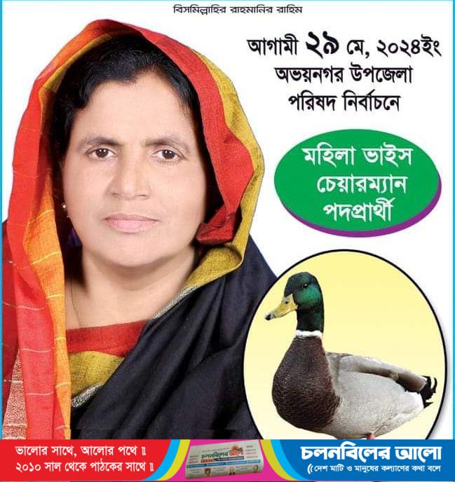 ভাবে ভোট কেন্দ্রে গিয়ে দিতে পারে, তাইলে জনগণের ভোটের মধ্যে দিয়েই তাকে জয়যুক্ত করবেন বলে এই আশাবাদ ব্যক্ত করেন এবং সকলের কাছে দোয়া কামনা করেন। এবং আগামী ২৯ মে তার প্রতীক হাঁস মার্কায় সকলকে ভোট দিতে আহবান করেন। সবাই মিলে তাকে ভোটদানের মাধ্যমে মহিলা ভাইস চেয়ারম্যান হিসেবে নির্বাচিত করলে অভয়নগরবাসীর কাছে তিনি চিরকাল ঋণী হয়ে থাকবেন।