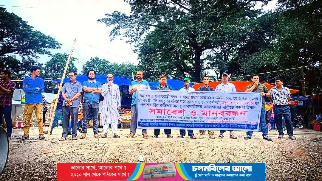 গাইবান্ধার পলাশবাড়ী খাদ্য গুদাম হতে ১১৯ মে:টন চাল ও ৩৪ হাজার ৯ শত ২৬টি খালি বস্তা চুরির ঘটনার সাথে জড়িত খাদ্য গুদাম কর্মকর্তা আব্দুল্লা আল মামুন সিদ্দিকী সহ পলাশবাড়ীর কতিপয় অসাধু ব্যাসায়ীদের গ্রেফতারের দাবিতে এক প্রতিবাদ সমাবেশ ও মানববন্ধন অনুষ্ঠিত হয়েছে।