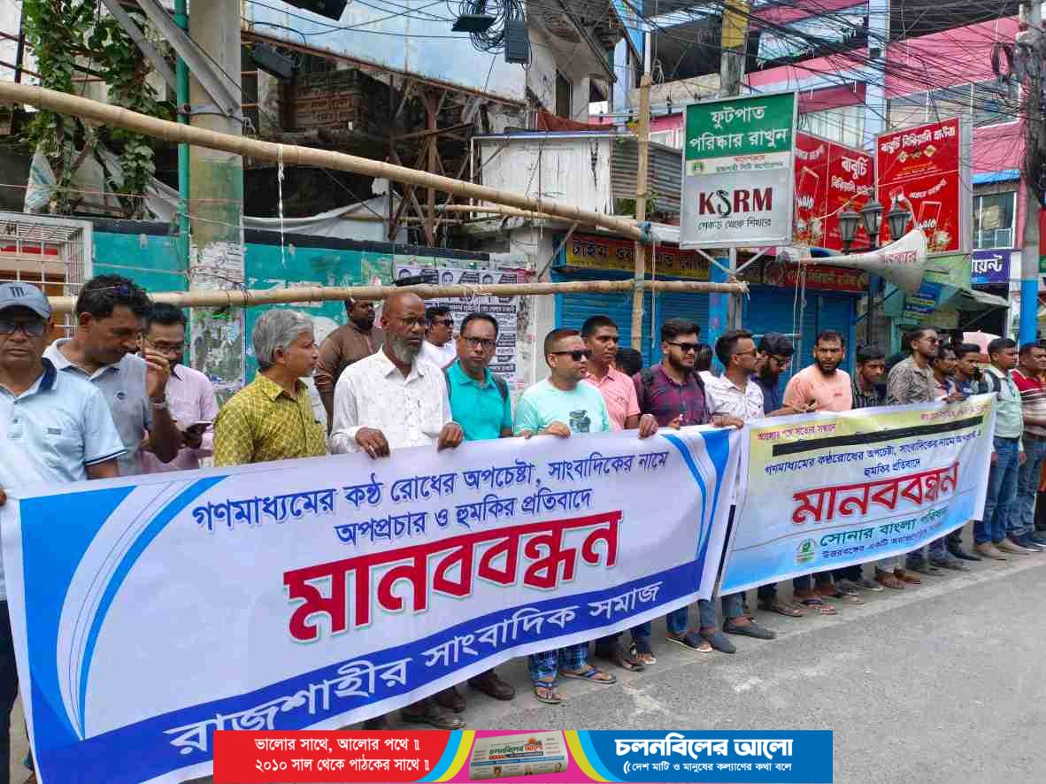 গণমাধ্যমের কণ্ঠ রোধ, সাংবাদিকদের নামে অপপ্রচার ও হুমকির প্রতিবাদে রাজশাহীতে মানববন্ধন অনুষ্ঠিত হয়েছে।