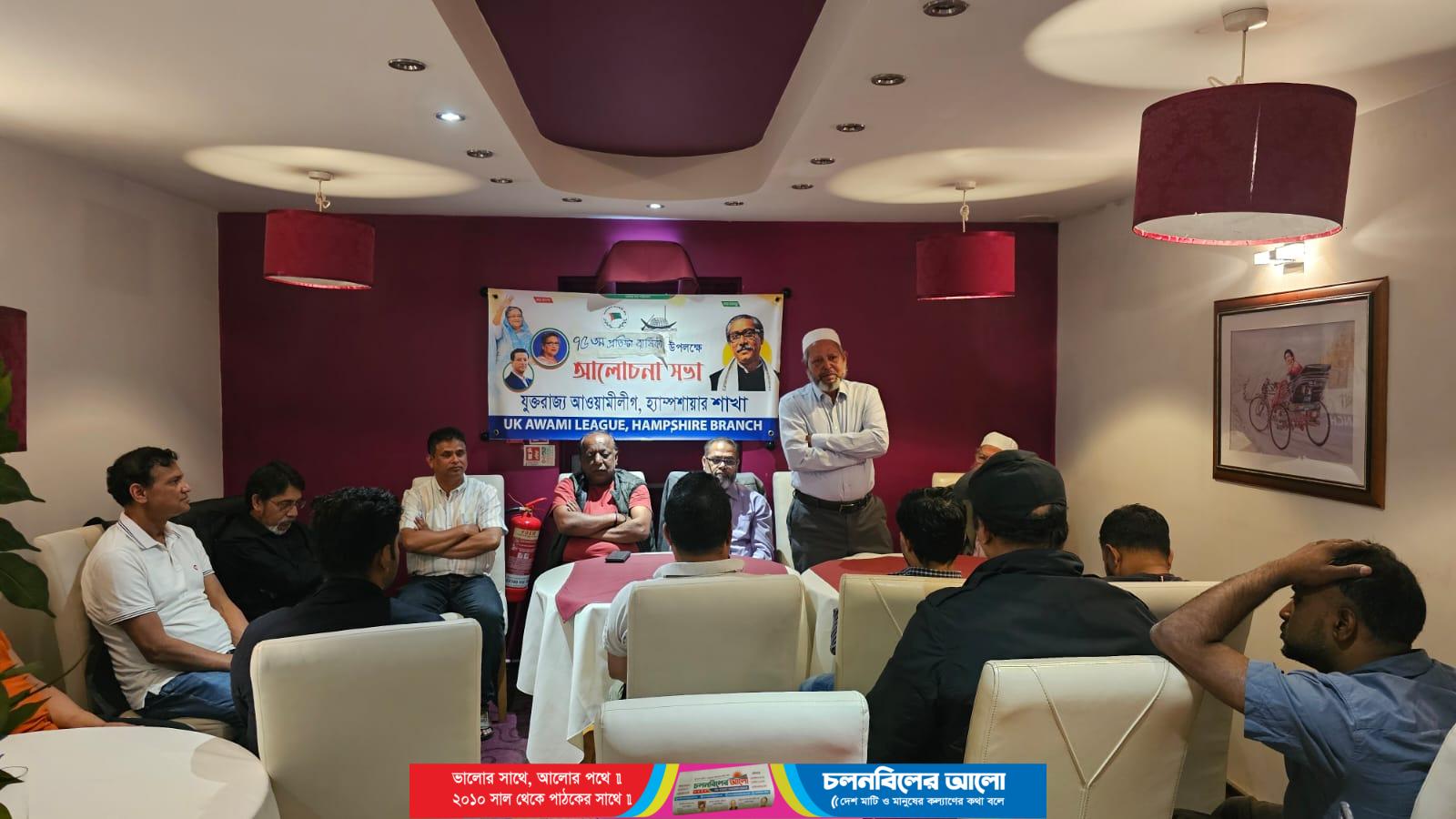 আওয়ামী লীগের ৭৫তম প্রতিষ্ঠাবার্ষিকী (প্ল্যাটিনাম জুবিলি) উপলক্ষে হাম্পশায়ার আওয়ামী লীগের উদ্যোগে আলোচনা সভা হয়েছে। রবিবার (২৩ জুন) জাহাঙ্গীর রেস্টুরেন্ট উনচেষ্টার রোড সাউথাম্পটনে রাত ১১ ঘটিকায় আলোচনা সভা অনুষ্ঠিত হয়।
