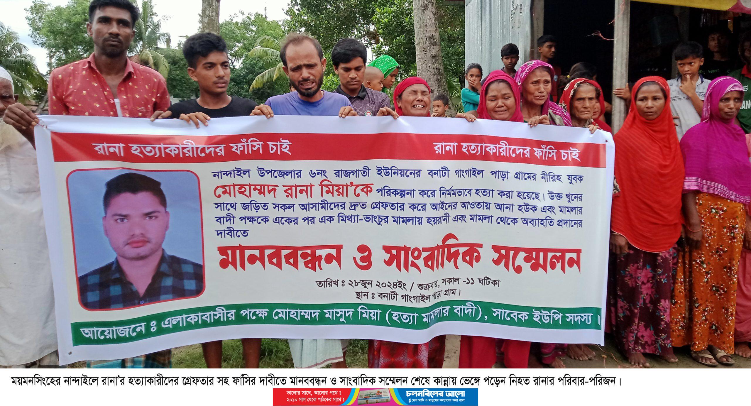 ময়মনসিংহের নান্দাইল উপজেলার ৬নং রাজগাতী ইউনিয়নের বনাটী গাংগাইল পাড়া গ্রামের নীরিহ যুবক রানা মিয়া (২৫) হত্যার মামলার আসামীদের অনতিবিলম্বে গ্রেফতার সহ ফাঁসির দাবীতে মানবন্ধন ও বিক্ষোভ মিছিল করেছে বাদীর পরিবার ও এলাকাবাসী। এছাড়া আসামীর পরিবার কর্তৃক একের পর এক মিথ্যা-ভাংচুর ও লুটপাটের মামলায় হত্যা মামলার বাদীর পরিবারকে হয়রানি করার গুরুতর অভিযোগ তুলে ধরা হয়। শুক্রবার (২৮জুন) রাজগাতী ইউনিয়নের বনাটী গাঙ্গাইল পাড়া গ্রামে মানববন্ধন ও সাংবাদিক সম্মেলনের আয়োজন করে রানা হত্যা মামলার বাদী সাবেক ইউপি সদস্য মোহাম্মদ মাসুদ মিয়া। সাংবাদিক সম্মেলনে বাদীর পক্ষে লিখিত বক্তব্য পাঠ করেন আব্দুল হেলিম রাজন। এছাড়া আরো বক্তব্য রাখেন শফিকুল ইসলাম ও মামলার বাদী মাসুদ মিয়া। পরে বাদীর পরিবার-পরিজন ও এলাকাবাসী রানা হত্যাকারীদের দৃষ্টান্তমূলক শাস্তি- ফাঁসির দাবীতে বিক্ষোভ মিছিল বের করে। মামলার বাদী মাসুদ মিয়া সহ পরিবারের লোকজন জানান, হত্যা মামলা দায়েরের পর থেকে আসামীরা মামলা তুলে নেওয়ার জন্য বাদী পক্ষকে ভয়ীভীতি ও হুমকি দিয়েই কান্ত হয়নি, বরং একের পর এক বাড়ি-ঘর ভাংচুর ও লুটপাটের মিথ্যা মামলা দিয়ে বাদীর পরিবার ও এলাকার নিরীহ লোকজনকে হয়রানি করছে। উক্ত মিথ্যা মামলা থেকে অব্যাহতি প্রদান সহ রানা’র খুনীদের দ্রুত গ্রেফতার ও ফাসিঁর জোর দাবী জানিয়ে সংশ্লিষ্ট উর্ধ্বতন পুলিশ প্রশাসনের জরুরী হস্তক্ষেপ কামনা করছেন বাদী পরিবার। এসময় নান্দাইলে কর্মরত ইলেক্ট্রনিক ও প্রিন্ট মিডিয়ার সাংবাদিকবৃন্দ সহ এলাকাবাসী উপস্থিত ছিলেন।