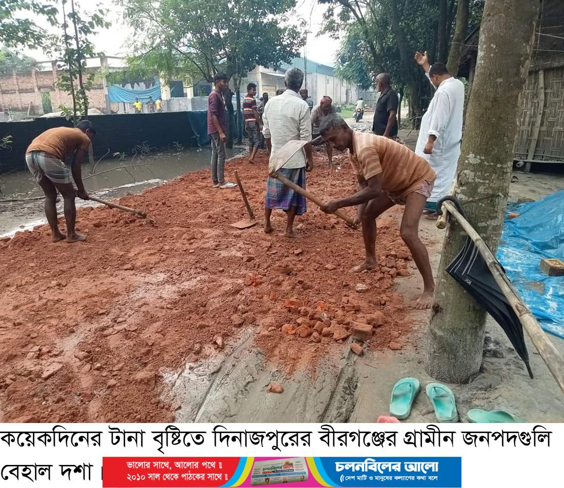 কয়েকদিনের টানা বৃষ্টিতে দিনাজপুরের বীরগঞ্জের গ্রামীন জনপদগুলি বেহাল দশা। রাস্তাগুলিতে বৃষ্টির পানি জমে থাকায় কাদা হয়ে যাওয়ার চলাচলের চরম দুর্ভোগে পড়ে উপজেলার বেশির ভাগ মানুষ। বর্ষাকালে গ্রামীণ সড়কে চলাচলে পথচারীসহ বিদ্যালয়ের শিক্ষার্থী, ব্যবসায়ী এবং কৃষককদের উৎপাদিত পন্য পরিবহণে দুর্ভোগে পড়তে হয় এই এলাকার মানুষকে। রাস্তায় কাঁদা পানি জমে থাকায় যানবাহন চলাচলে অযোগ্য হওয়ায় এলাকাবাসী সবচেয়ে বেশী ভোগান্তিতে পড়ে অসুস্থ্য মানুষকে নিয়ে। দীর্ঘদিন ধরে রাস্তাগুলি পাকাকরণ এবং সংস্কারে সরকারী উদ্যোগ গ্রহণ না করায় নিরুপায় হয়ে স্বেচ্ছাশ্রমে রাস্তা সংস্কারে উদ্যোগ গ্রহণ করেন এলাকাবাসী।