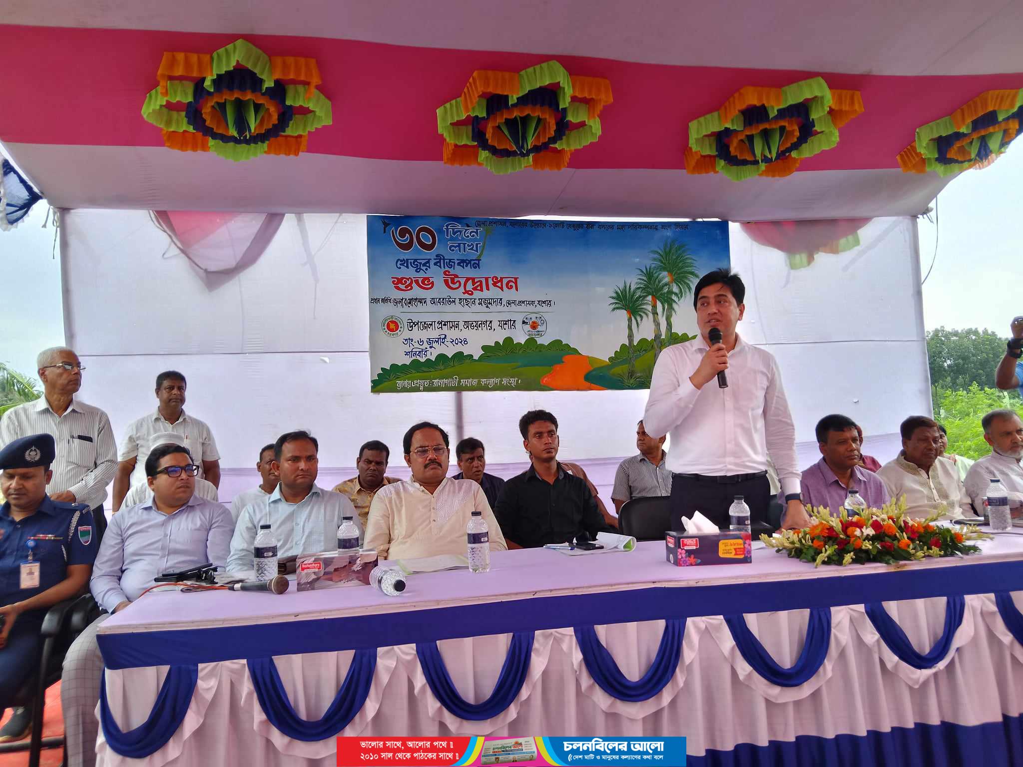 যশোর জেলার অভয়নগর উপজেলায় ৩ হাজার খেজুর চারা রোপণের মধ্য দিয়ে ৩০ দিনে ৩০ লাখ খেজুর বীজ রোপণের উদ্বোধন করলেন, যশোর জেলা প্রশাসক মোঃ আবরাউল হাছান মজুমদার। পরিবেশের ভারসাম্য রক্ষায় যশোর জেলাজুড়ে বৃহৎ পরিসরে বৃক্ষরোপণ ও জেলার ঐতিহ্যবাহী খেজুরের রস ও গুড় শিল্পের টেকসই সংরক্ষণের উদ্দেশ্যে চলতি বর্ষা মৌসুমে জেলায় ১ কেটি খেজুরের বীজ বপন ও ১৫ হাজার চারা রোপণের উদ্যোগ নিয়েছে জেলা প্রশাসন। তার অংশ হিসেবে শনিবার (৬ জুলাই) দুপুর ১২ টায় উপজেলা প্রশাসনের আয়োজনে প্রেমবাগ ইউনিয়নের চাপাতলার ভৈরব নদীর তীরে ৪ একর জমির উপর এ খেজুর বীজ ও চারাগাছ বপনের উদ্বোধন অনুষ্ঠিত হয়। উপজেলা নির্বাহী অফিসার কে এম আবু নওশাদের সভাপতিত্বে প্রধান অতিথি হিসেবে উদ্বোধন অনুষ্ঠানের আলোচনা সভায় বক্তব্য রাখেন যশোর জেলা প্রশাসক মোঃ আবরাউল হাছান মজুমদার। বিশেষ অতিথি হিসেবে উপস্থিত থেকে বক্তব্য রাখেন,উপজেলা পরিষদের চেয়ারম্যান সরদার অলিয়ার রহমান, নওয়াপাড়া পৌরসভার মেয়র সুশান্ত কুমার দাস, কৃষি সম্প্রসারণ অধিদপ্তর যশোরের উপপরিচালক সুশান্ত কুমার তরফদার, অভয়নগর থানার অফিসার ইনচার্জ এস এম আকিকুল ইসলাম, প্রেমবাগ ইউপি চেয়ারম্যান মফিজ উদ্দিন। এ সময় আরো উপস্থিত ছিলেন, সহকারী কমিশনার ও এক্সিকিউটিভ ম্যাজিস্ট্রেট মাহির দয়াল আমীন,সহকারী কমিশনার ভূমি মোঃ শামীম, হুসাইন, নওয়াপাড়া সরকারি কলেজের অধ্যক্ষ রবিউল হাসান, নওয়াপাড়া প্রেসক্লাবে সভাপতি নজরুল ইসলাম মল্লিক,উপজেলা ভাইস চেয়ারম্যান আখতারুজ্জামান তারু,উপজেলা মহিলা ভাইস চেয়ারম্যান সাফিয়া খানম, ইউনিয়ন পরিষদের চেয়ারম্যান বিকাশ রায় কপিল, তৈয়্যবুর রহমান, এ্যাড নাসির উদ্দীন, কৃষি কমকর্তা লাভলী খাতুন, মডেল কলেজের অধ্যক্ষ মহিদুল ইসলাম টোকন, পল্লীমঙ্গল আদর্শ কলেজের অধ্যক্ষ খাইরুল বাশার, পায়রা ইউনাইটেড কলেজের অধ্যক্ষ সেলিম খান,সুন্দলী এসটিএন্ড কলেজের অধ্যক্ষ আব্দুল লতিপ, প্রেমবাগ ইউনিয়ন আওয়ামীলীগের সভাপতি বাবুল আক্তার, আওয়ামী লীগ নেতা রবিউল ইসলামসহ উপজেলা পরিষদের কর্মকর্তা বৃন্দ উপস্থিত ছিলেন। অনুষ্ঠান পরিচালনা করেন সাংবাদিক সুনিল দাস। অনুষ্ঠান শেষে প্রধান অতিথিসহ অন্যান্য অতিথি বৃন্দ খেজুর গাছের বীজ রোপন করে অনুষ্ঠানের উদ্বোধন ঘোষণা করেন। উল্লেখ্য,উপজেলার নদীর পাড়, শিক্ষাপ্রতিষ্ঠান ও রাস্তার দুই পাসের খাস জমির মোট ২১ একর জমিতে বীজ রোপণ করা হবে। অনুষ্ঠানে বক্তারা বলেন, পর্যায়ক্রমে বাকি উপজেলাগুলোতেও খেজুর বীজ বপনের উৎসব অনুষ্ঠিত হবে। খেজুর বীজ ও চারা বপনের জন্য উপজেলা পর্যায়ে উপযুক্ত স্থান নির্বাচনের কাজ চলমান রয়েছে। বরাবরের মতো সরকারি খাস জমিকে অগ্রাধিকার দেওয়া হলেও এবার ব্যক্তিগ