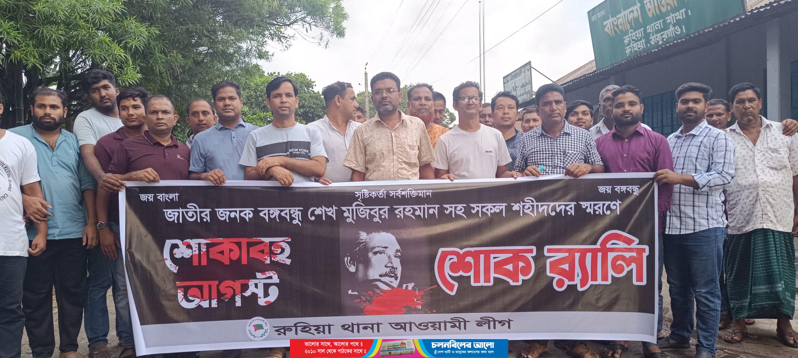 ঠাকুরগাঁওয়ের রুহিয়ায় শোকাবহ আগস্টের প্রথম দিন শোকর‌্যালি ও দোয়া মোনাজাত অনুষ্ঠিত হয়েছে। বৃহস্পতিবার বিকেলে  রুহিয়া থানা  আওয়ামী লীগের আয়োজনে রুহিয়া থানা আওয়ামী লীগ কার্যালয়ের সামনে থেকে একটি শোক র‌্যালি শুরু হয়।র্যালরটি শহরের বিভিন্ন সড়ক প্রদক্ষিণ শেষে পুনরায় আওয়ামীলীগ কার্যালয়ে এসে শেষ হয়।