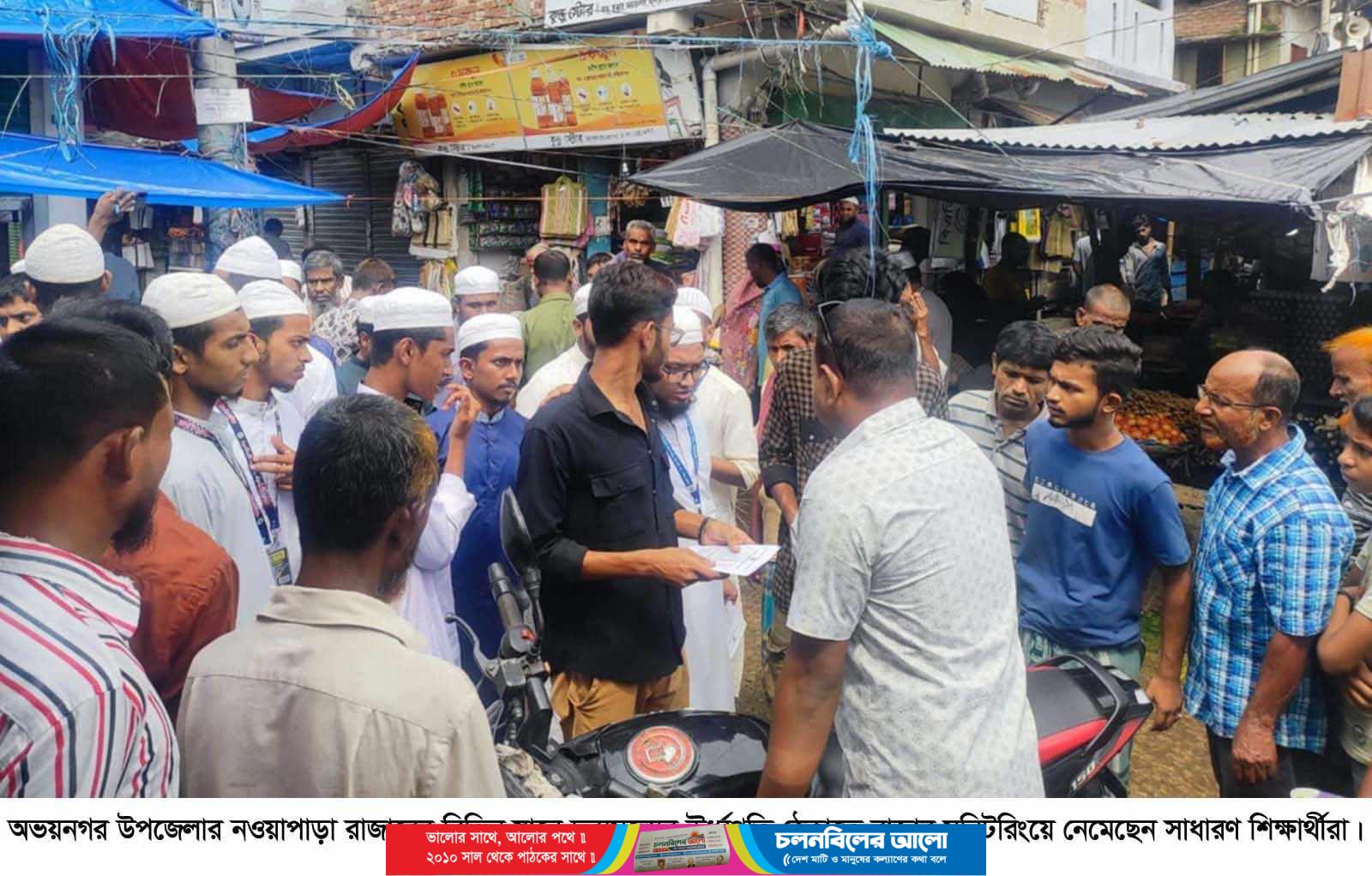 যশোরের অভয়নগরে দ্রব্যমূল্যের ঊর্ধ্বগতি ঠেকাতে এবার বাজার মনিটরিংয়ে নেমেছেন সাধারণ শিক্ষার্থীরা। সড়কে ট্রাফিক নিয়ন্ত্রণ পাশাপাশি তারা বাজার মনিটরিং শুরু করেছেন। শনিবার (১০ আগস্ট) সকালে উপজেলার নওয়াপাড়া বাজরের বিভিন্ন স্থানে মনিটরিংয়ে যান সাধারণ শিক্ষার্থীরা। তারা নিত্যপ্রয়োজনীয় পণ্যের দাম ও দ্রব্যমূল্যের তালিকা পর্যবেক্ষণ করে ব্যবসায়ীদের সঙ্গে কথা বলছেন। এতে কমছে পণ্যের দাম।