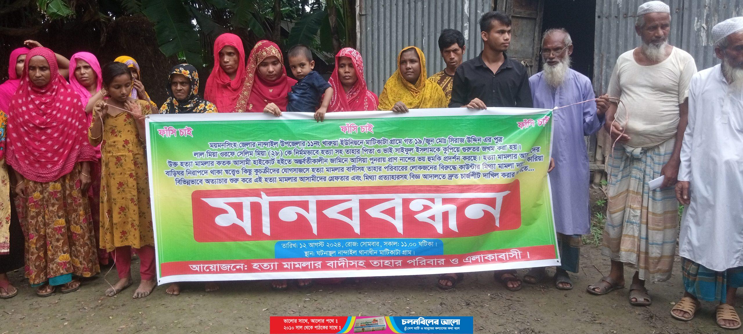 নান্দাইলে লাল মিয়া হত্যা মামলার আসামীদের গ্রেফতার ও ফাঁসির দাবীতে মানববন্ধন