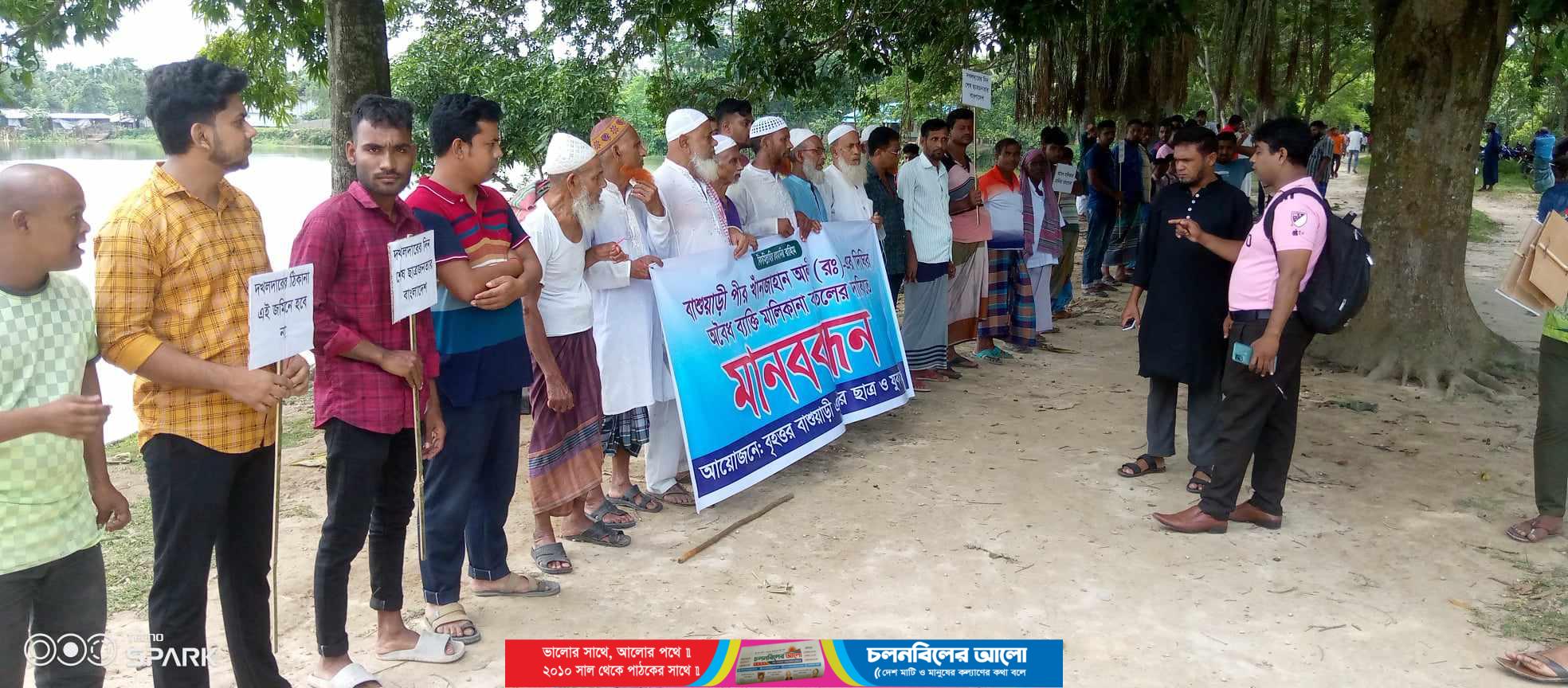 যশোরের অভয়নগর উপজেলার বাশুয়াড়ী গ্রামের খানজাহান আলী দীঘি নামে খ্যাত সরকারি জলাসয় নিয়ে দীর্ঘদিন আওয়ামী লীগের ছত্রছায়ায় থাকা ব্যক্তি জোরজুলুমে ও ক্ষমতার অপব্যবহারে দখল করে রাখায় ওই এলাকার সাধারণ মানুষের মাঝে ক্ষোভের কোন শেষ নেই। ফলে সরকারি জমি সরকারের অনুকূলে রাখতে এলাকার সাধারণ মানুষ ব্যাপক সমাগম মানুষের উপস্থিতিতে মানববন্ধন কর্মসূচি পালন করেছে। সোমবার সকাল ১১ টায় বাশুয়াড়ী দীঘির পাড়ে ওই মানববন্ধন কর্মসূচি অনুষ্ঠিত হয়। এসময় মানববন্ধনে আনুঃ প্রাই ৬ শতাধিক সাধারণ মানুষ স্কুলের শিক্ষার্থীসহ দুই শতাধিক নারীরা মানববন্ধনে উপস্থিত থেকে ভূমিদস্যু আক্তারুল পান্না নামের ব্যক্তির বিরুদ্ধে বিভিন্ন স্লোগানে এলাকা মুখরিত করে তোলেন। এসময় স্থানীয় উপস্থিত ব্যক্তিরা তাদের বক্তব্য বলেন।