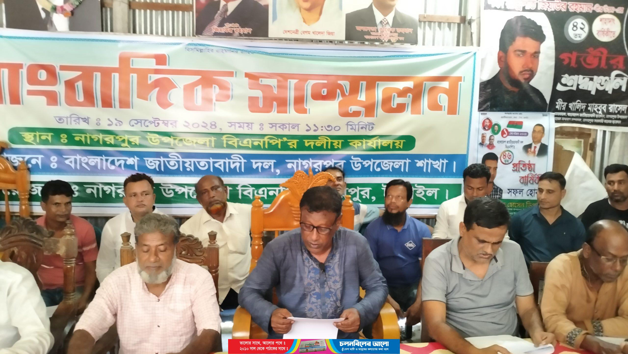 টাঙ্গাইলের নাগরপুর উপজেলা বিএনপি’র অঙ্গ ও সহযোগী সংগঠনের নেতাকর্মীদের নামে সময়ের কন্ঠস্বর, টাঙ্গাইল সমাচার, টাঙ্গাইল প্রতিদিনসহ কয়েকটি প্রিন্ট ও অনলাইন প্রোর্টালে মিথ্যা খবর প্রচারের প্রতিবাদে সংবাদ সম্মেলন করেছেন উপজেলা বিএনপি। বৃহস্পতিবার (১৯ সেপ্টেম্বর) দুপুরে দলীয় কার্যালয়ে এ সংবাদ সম্মেলনের আয়োজন করেন বাংলাদেশ জাতীয়তাবাদী দল নাগরপুর উপজেলা শাখা। সংবাদ সম্মেলনে লিখিত বক্তব্য পাঠ করেন নাগরপুর উপজেলা বিএনপি’র সাধারন সম্পাদক মো. হাবিবুর রহমান হবি।