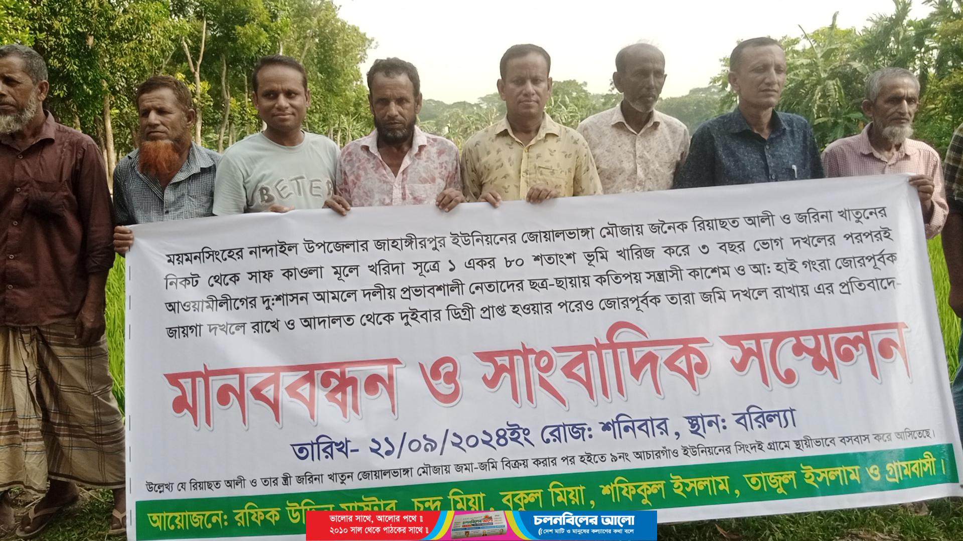 ময়মনসিংহের নান্দাইল উপজেলার এক শিক্ষক গত ১৪ বছর ধরে আওয়ামীলীগের মদদপুষ্ট সন্ত্রাসীর কবল থেকে জমি ফেরত পাচ্ছেন না বলে শনিবার (২১ সেপ্টেম্বর) দুপুরে সংবাদ সম্মেলন করে এ অভিযোগ করেন শিক্ষক মো. রফিক। তিনি উপজেলার উপজেলার জাহাঙ্গীরপুর ইউনিয়নের বরিল্লা গ্রামের আবদুল মন্নাছের পুত্র ও একই ইউনিয়নের রায়পাশা উচ্চ বিদ্যালয়ের ইংরেজি বিষয়ের শিক্ষক হিসাবে কর্মরত। সংবাদ সম্মেলনে শিক্ষক রফিক বলেন, ২০০৭ সালে আমরা চার ভাই মিলে পৃথক দলিল মূলে ১.৮০ একর আবাদি জমি ক্রয় করি। জোয়ালভাঙা গ্রামের রিয়াসত আলী আমাদের নিকট জমি বিক্রি করেছিলেন। রিয়াসত আলী জমি বিক্রি করে পাশের আচারগাঁও ইউনিয়নের সিংদই গ্রামে গিয়ে বসতি গড়ে তুলেন। জমি ক্রয় করার পর তিন বছর জমিতে আবাদ করে ভোগ দখল করেন। ২০১০ সালে পুরো জমি রিয়াসত আলীর পুত্র আবদুল কাশেম জোরপূর্বক জমি দখল করে নিয়ে চাষাবাদ শুরু করেন। তিনি সরাসরি রাজনীতি করেন না সমর্থক করতে এবং তার ভাইয়েরা বিএনপির রাজনীতির সাথে জড়িত ছিলেন। তৎকালীন সময়ে জমি দখল করার ঘটনায় থানায় অভিযোগ দিলেও ইউনিয়ন ও উপজেলা আওয়ামীলীগের নেতৃবৃন্দের প্রভাবে কোনো বিচার পাননি। রফিক আরও জানান, রিয়াসত আলী ঈশ্বরগঞ্জ চৌকি আদালতে তাঁর চারটি সাফ কবলা দলিল পন্ড করার দাবি জানিয়ে মোকদ্দমা দায়ের করেন। সেই মোকদ্দমা বিচার শেষে আদালত তাঁর (রফিক) কে ডিক্রি (রায়) দেন। ভুয়া তথ্য দিয়ে মামলা দায়ের করার জন্য মামলার বাদী আবুল কাশেমকে ছয় হাজার টাকা জরিমানা করেন বিজ্ঞ আদালত। এই আদালতে হেরে কাশেম ময়মনসিংহের দ্বিতীয় সাবজজ আদালতে আপিল করেন। সেই আপিল শুনানি শেষে ২০১৭ সালের ১৮ নভেম্বর আদালত তাঁর পে দেন। দুটি আদালত থেকে পর পর দুটি ডিক্রি পাবার পরও আবদুল কাশেম আওয়ামী লীগের নেতৃবৃন্দের মদদে তাঁর ১.৮০ একর ফসলি জমি জোরপূর্বক দখল করে রাখেন। শিক্ষক রফিক আবেগাপ্লুত হয়ে সাংবাদিকদের উদ্দেশ্যে বলেন, পতিত সরকারের দানব জাতীয় নেতারা আমার মতো অনেক নিরীহ মানুষের প্রভুত তি করেছে। গ্রামে গ্রামে গিয়ে দেখুন শত শত পরিবারের কান্না শুনতে পারবেন। এখন অন্তবর্তী সরকার প্রতিষ্ঠিত হয়েছে। আইন-আদালতের প্রতি মানুষ বিশ্বাস করতে শুরু করেছে। আমার ওপর ১৪ বছর যাবৎ যে অন্যায় হয়েছে তার প্রতিকার চাই। জোয়াল ভাঙা গ্রামে গিয়ে শিকের অভিযোগ প্রসঙ্গে জানতে চাইলে আবুল কাশেম (৫৭) বলেন, আমার বাবা-মাকে ভুল বুঝিয়ে জমি কিনে নিয়েছে। তাই তিনি বাবার জমি ছেলে হিসেবে ভোগ দখল করছেন।