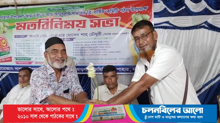 সোমবার রাত সাড়ে ৮ টায় উপজেলা সদরের মেসার্স রিফাত ফল ভান্ডার আড়ৎ ঘরে সাপাহার উপজেলা আম চাষী ও আড়ৎদার সমিতির আয়োজনে উক্ত সমিতির কমিটি ঘোষণা উপলক্ষে এক মতবিনিময় সভা অনুষ্ঠিত হয়। এতে সভাপতিত্ব করেন সমিতির আহবায়ক রেজাউল করিম। অনুষ্ঠানে প্রধান অতিথি হিসেবে উপস্থিত ছিলেন বিশিষ্ট সমাজ সেবক মোতাহার হোসেন শাহ্ চৌধুরী। মতবিনিময় সভা শেষে পূর্বের আহবায়ক কমিটি বিলুপ্ত ঘোষণা করে কার্য নির্বাহী কমিটি এবং উপদেষ্টা কমিটির নাম ঘোষণা করেন অনুষ্ঠানের প্রধান অতিথি মোতাহার হোসেন শাহ্ চৌধুরী।