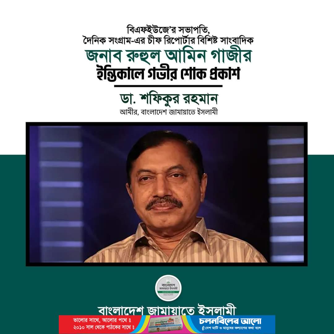 বাংলাদেশ ফেডারেল সাংবাদিক ইউনিয়ন-বিএফইউজে’র সভাপতি, দৈনিক সংগ্রাম-এর চীফ রিপোর্টার বিশিষ্ট সাংবাদিক জনাব রুহুল আমিন গাজীর ইন্তিকালে গভীর শোক প্রকাশ করে বাংলাদেশ জামায়াতে ইসলামীর আমীর ডা. শফিকুর রহমান ২৪ সেপ্টেম্বর এক শোকবাণী প্রদান করেছেন।